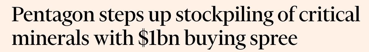 The Pentagon is looking to buy as much as $1 billion in critical minerals, a move Washington hopes will offset China’s recent export restrictions on rare earths and related materials. The Defense Logistics Agency (DLA) initiative would stockpile essentials like cobalt, antimony (remember this word), tantalum, and scandium, which are all vital to such defense technologies as radar systems and fighter jets.
