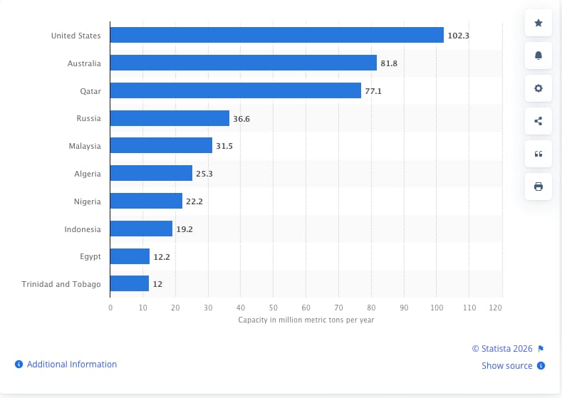 After years as the leader, Qatar has fallen to No. 3 on the list of LNG exporters — behind the United States (No. 1) and Australia (No. 2), says Statista.com (see chart below).
