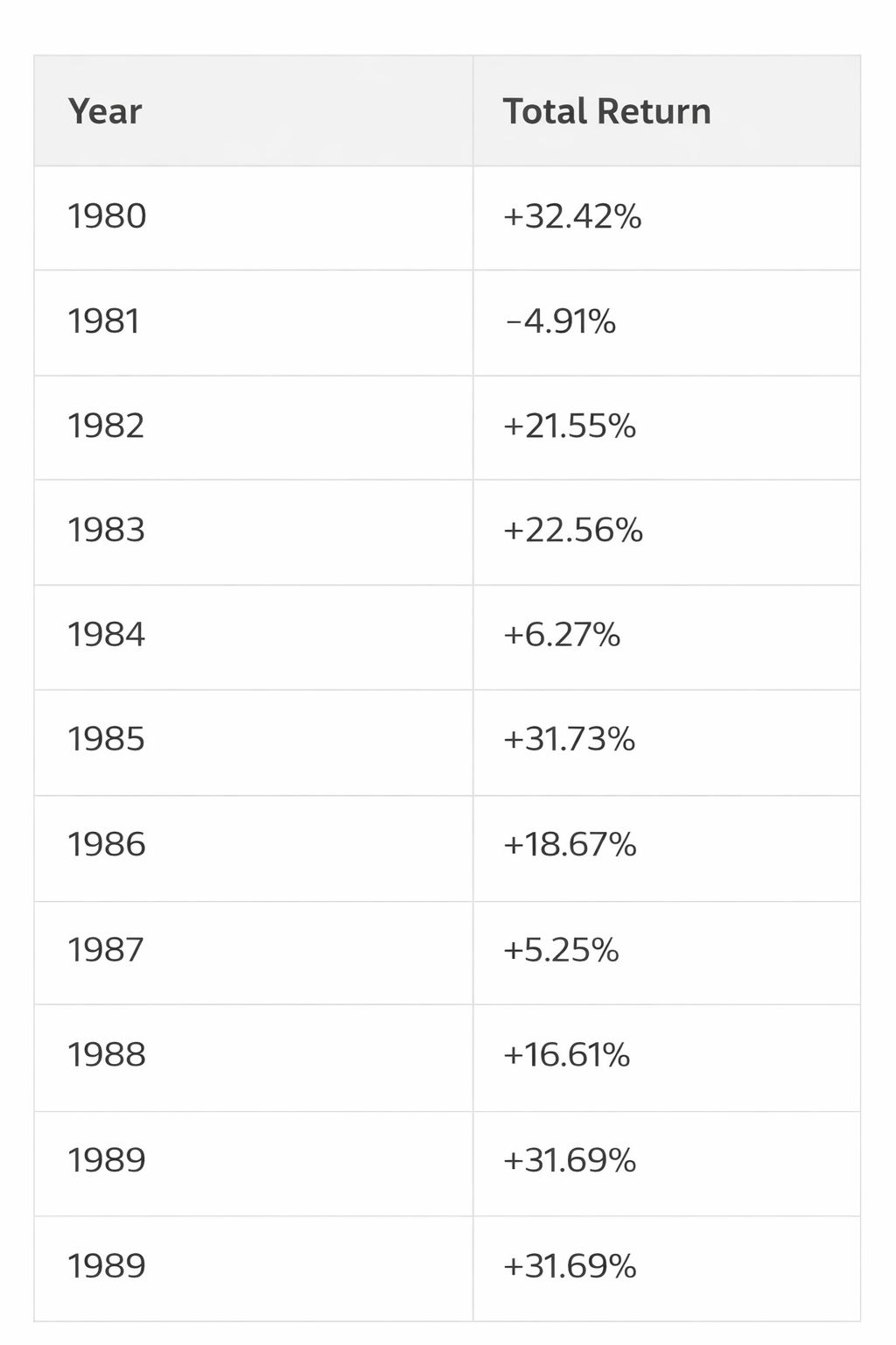 Years of note included gains of 30.5% in 1991, 37.6% in 1995 and 33.4% in 1997.